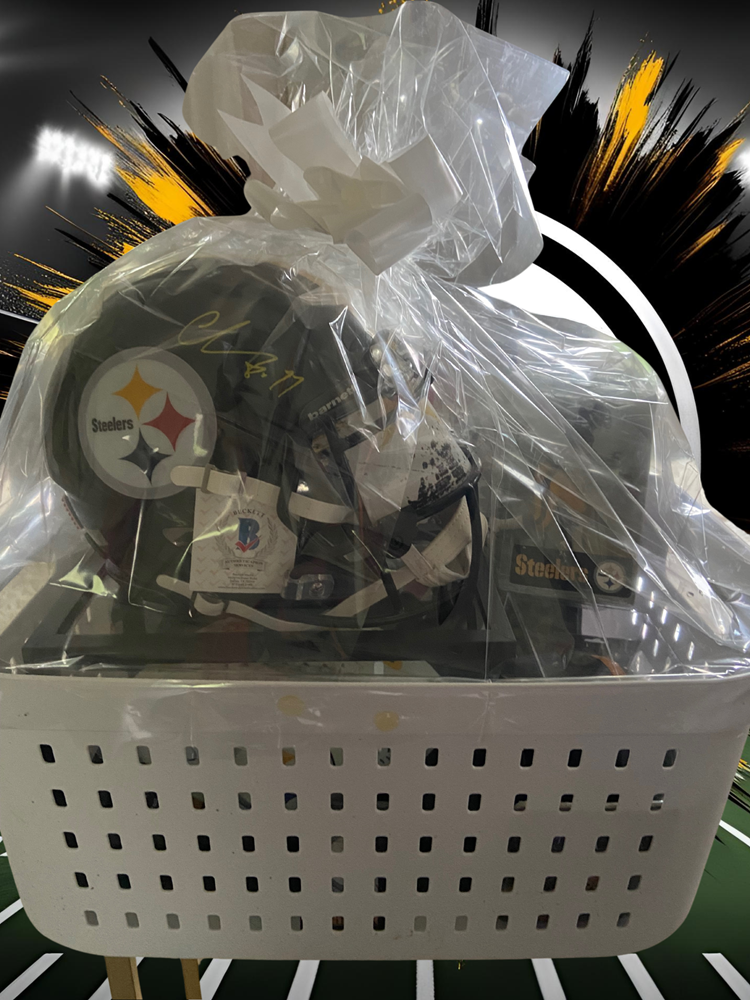 A must-have for any true Pittsburgh Steelers fan! This incredible basket is packed with collectibles, autographs, and fan favorites, including: • Chase Claypool autographed full-size Speed replica helmet, featuring a custom visor, 3D bumpers, decals, and Beckett COA. • Randy Grossman autographed mini helmet, inscribed “IX X XIII XIX” with Bosley COA. • Merril Hoge autographed 8x10 custom-framed photo. • Frenchy Fuqua autographed Super Bowl logo football, inscribed with his famous quote “I’ll never tell” and TSE COA. • McFarlane “Legends Series 2” Mean Joe Greene collectible figure. • T.J. Watt commemorative plaque. • Steelers-themed extras: playing cards, fidget spinner, coaster set, and a 2-pack of baby bottles for the littlest Steelers fans! Show off your Steelers pride or gift it to the ultimate fan — this basket is one-of-a-kind and loaded with Black and Gold greatness! ~Provided by the Husk Family~