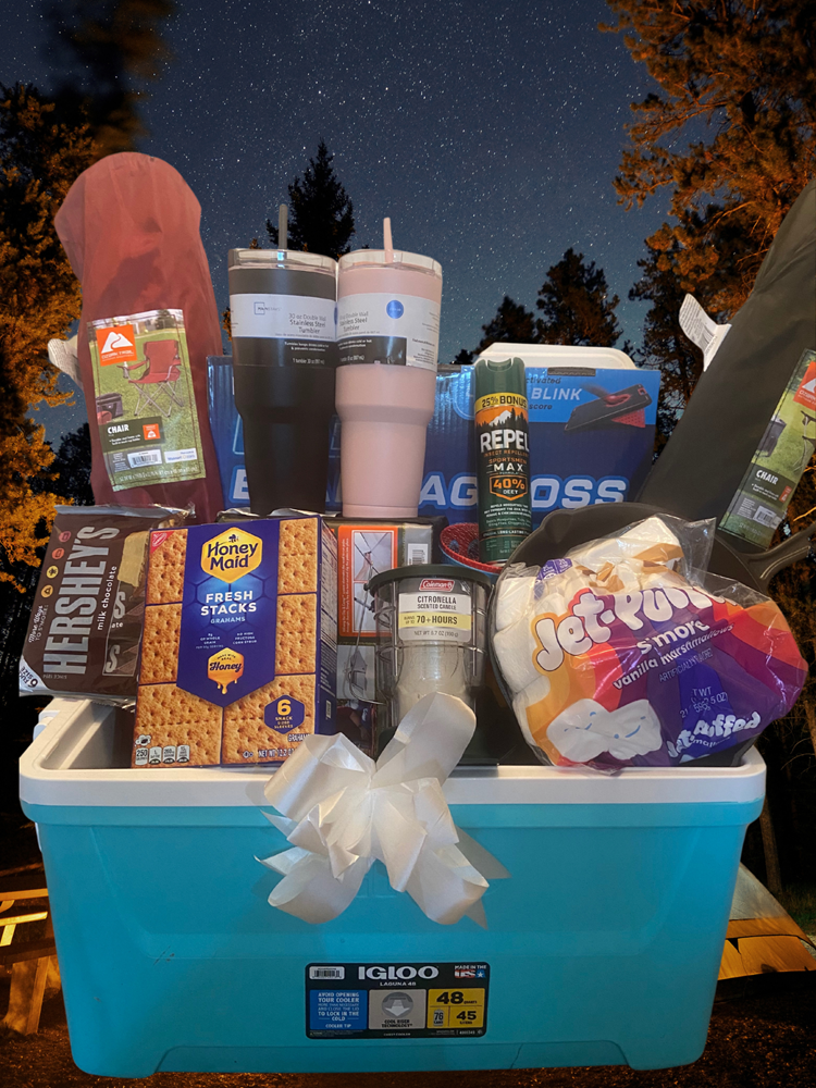 Gear up for your next outdoor adventure with this camping essentials basket, perfect for weekends in the woods or backyard fun! This packed set includes: • Igloo 48qt cooler to keep your food and drinks perfectly chilled. • 3-person Clip and Camp dome tent for a cozy night under the stars. • Two camping chairs for fireside relaxation. • Two 30oz tumblers to keep your beverages hot or cold. • 10.5-inch cast iron skillet — perfect for campfire cooking. • Duraflame fire starters (2-pack) to make lighting a breeze. • LED bean bag toss game for daytime or nighttime fun. • Catch ball game to keep the whole family entertained. • Playing cards for classic camping entertainment. • Insect repellent and citronella candle lantern to keep the bugs away. • 21oz marshmallows, 12.2oz graham crackers, Hershey bars, and toaster forks — everything you need for the perfect s’mores night! Get ready to unplug, unwind, and enjoy the great outdoors with this all-in-one camping package! ~Donated by the Husk Family~