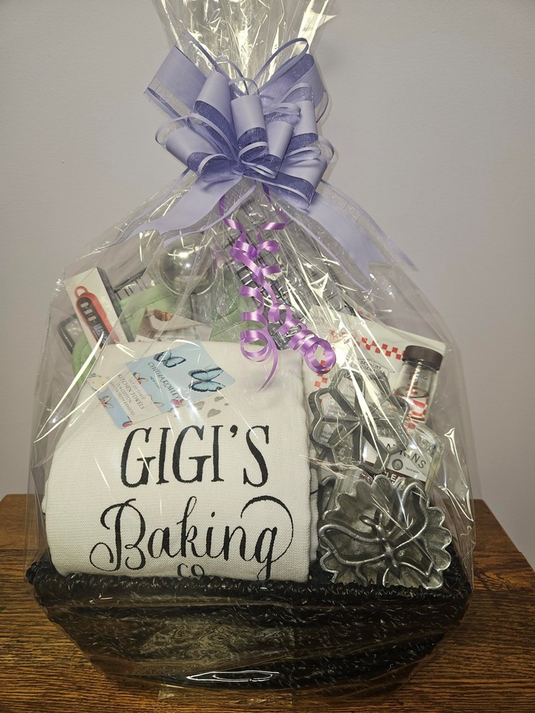 Basket includes pot holders, cooling racks, kitchen towles, vanilla flavoring, powder sugar shaker waterproof thermometer, Rosette Mix and Vintage Rosette Iron molds with handle.