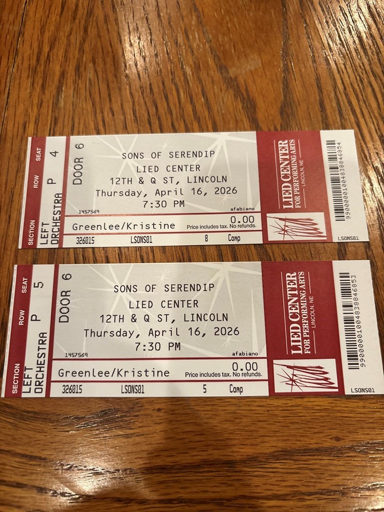 2 tickets to Sons of Serendip at the Lied Center in Lincoln. $160 value.