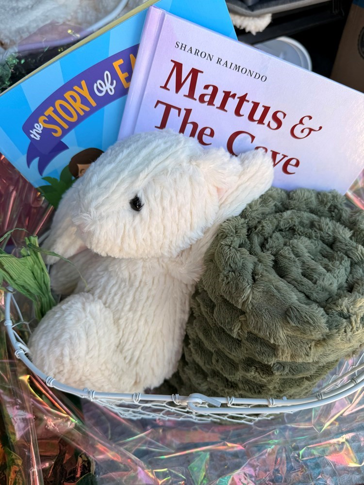 Easter gift basket with Martus & The Cave book written by local author, Sharon Raimondo along with stickers, blanket and stuffed bunny. $40 value